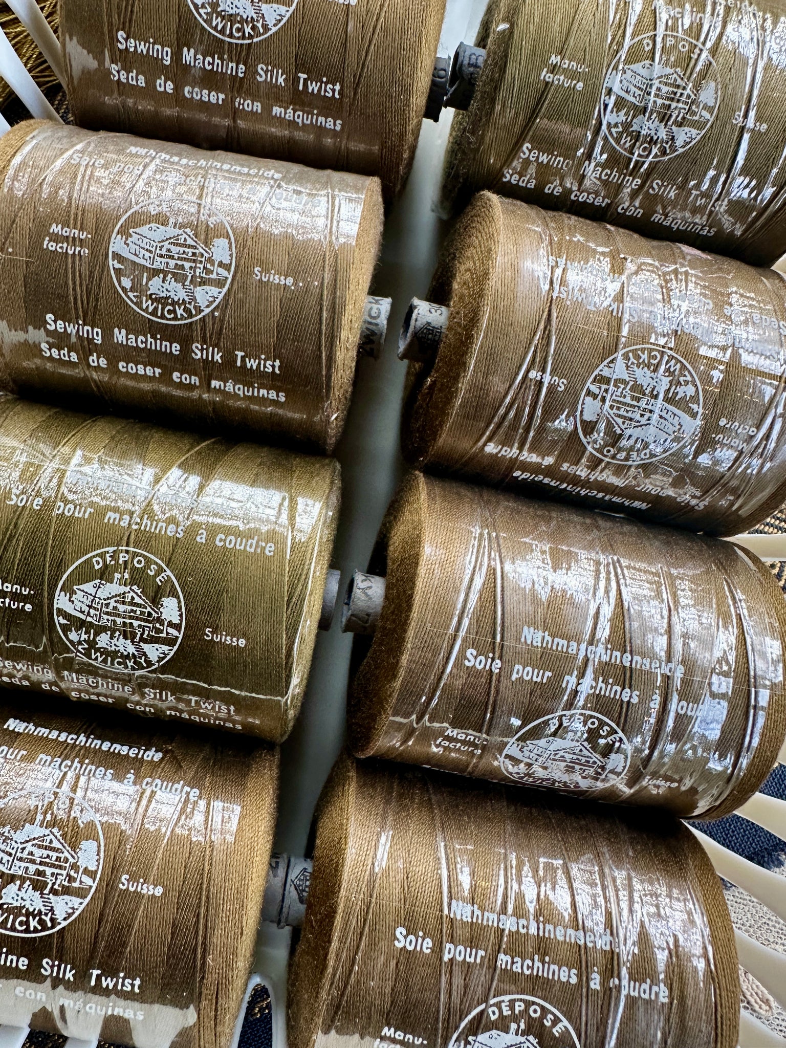 Fine quality sewing/machine silk spools dates from the 1970's and have been stored wrapped in cellophane in their original boxes.