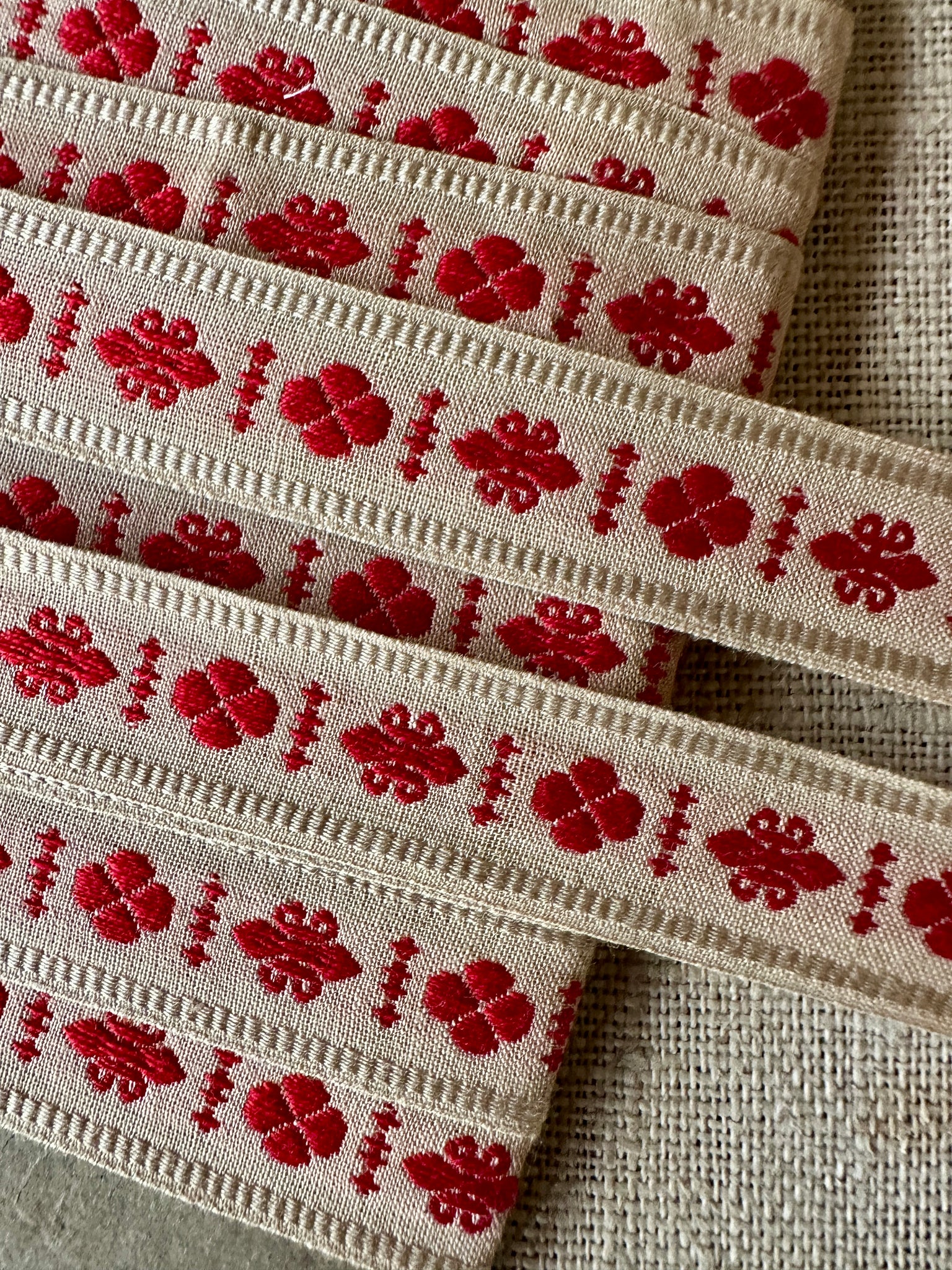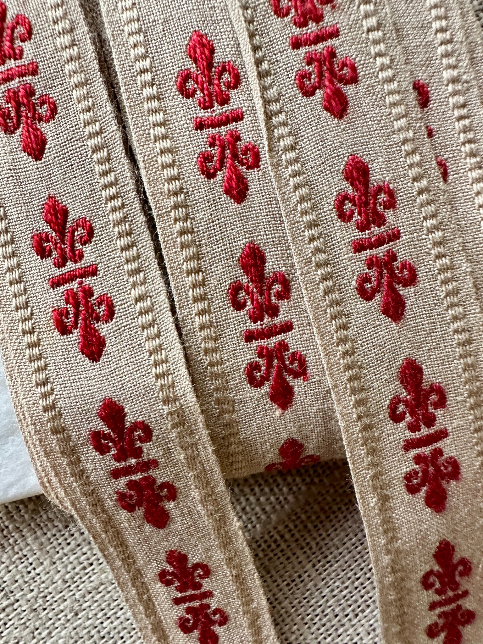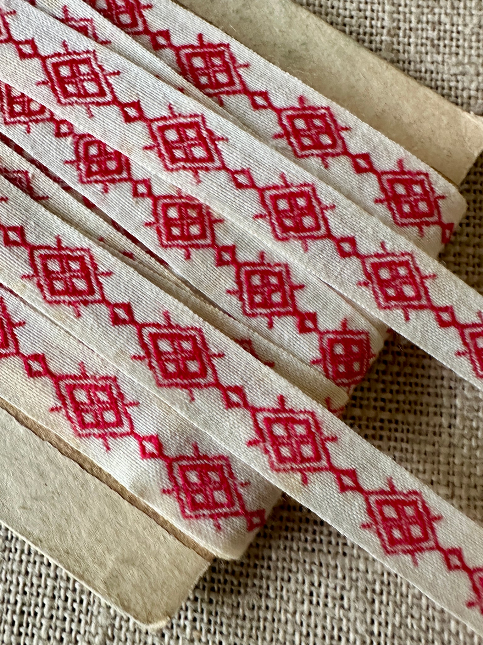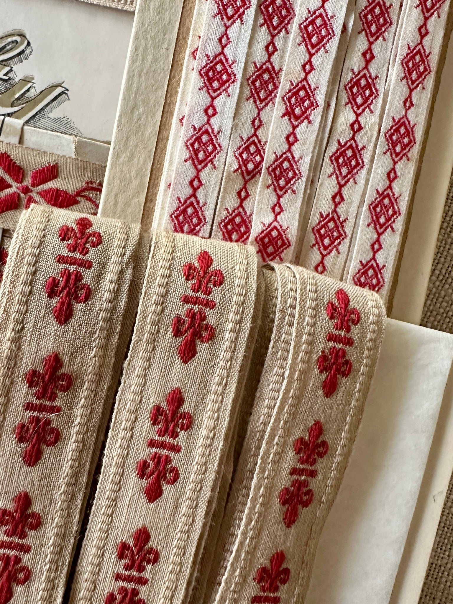 Antique French and German trims are very finely woven with tiny Turkey red motifs in six different styles.