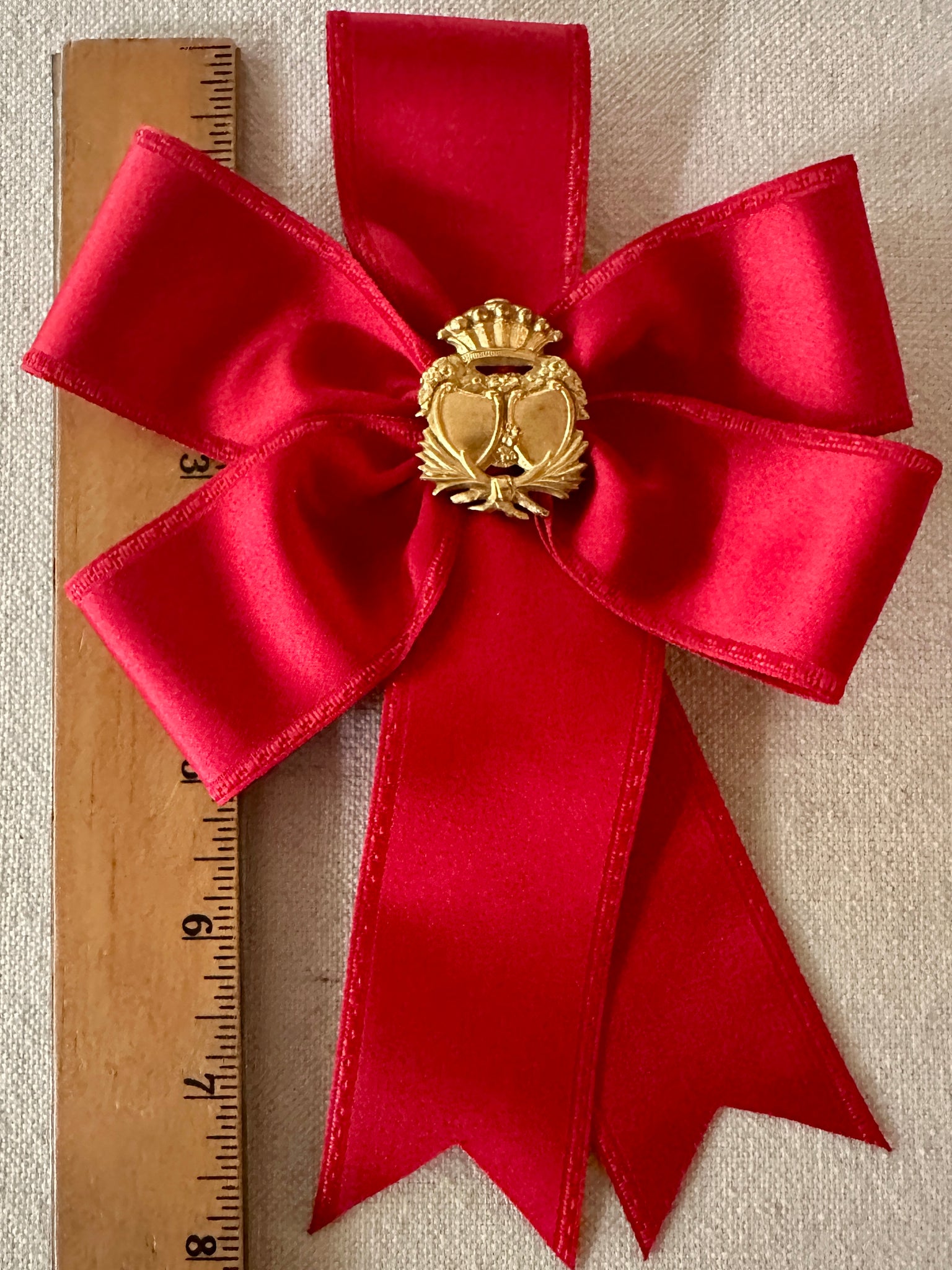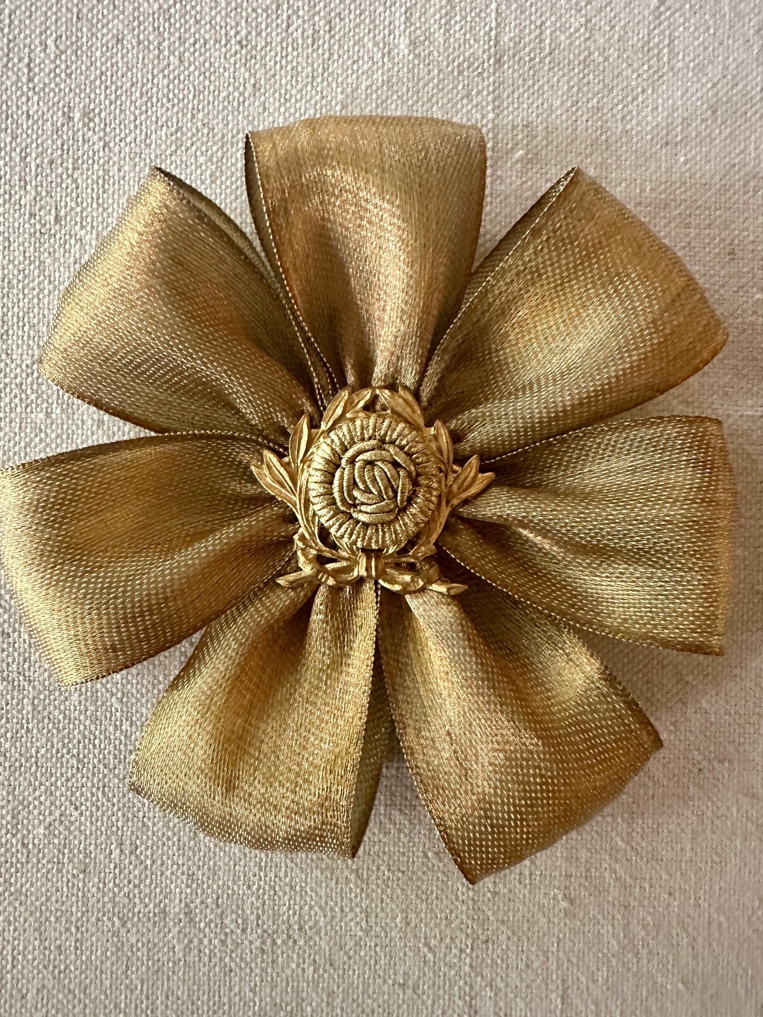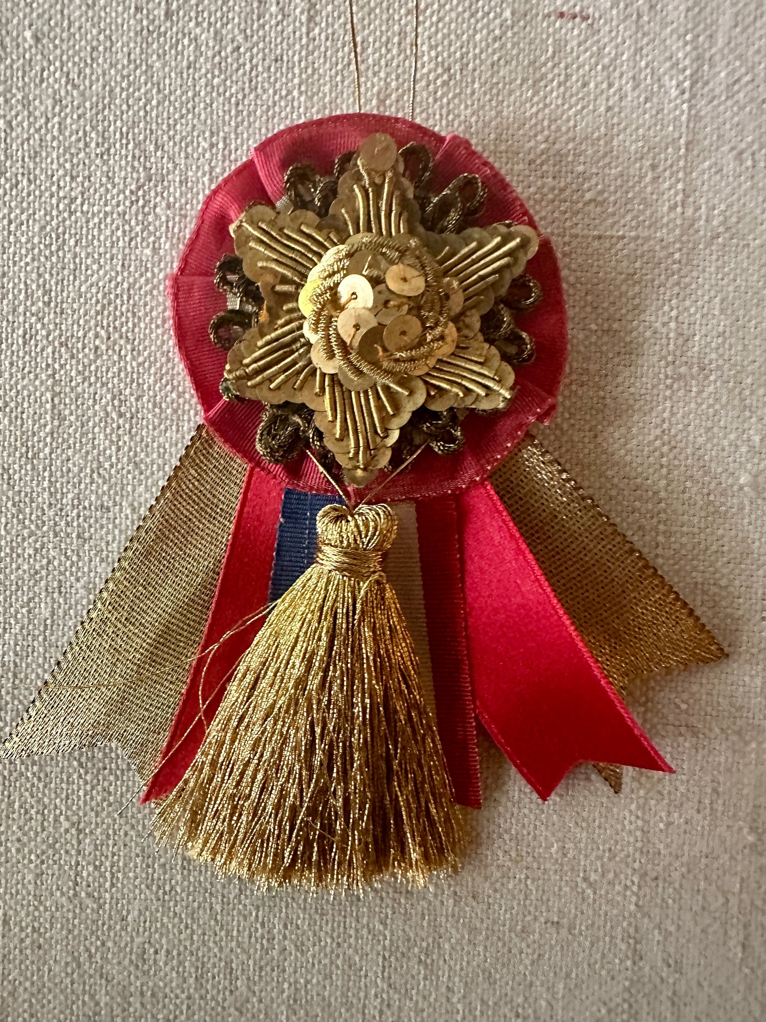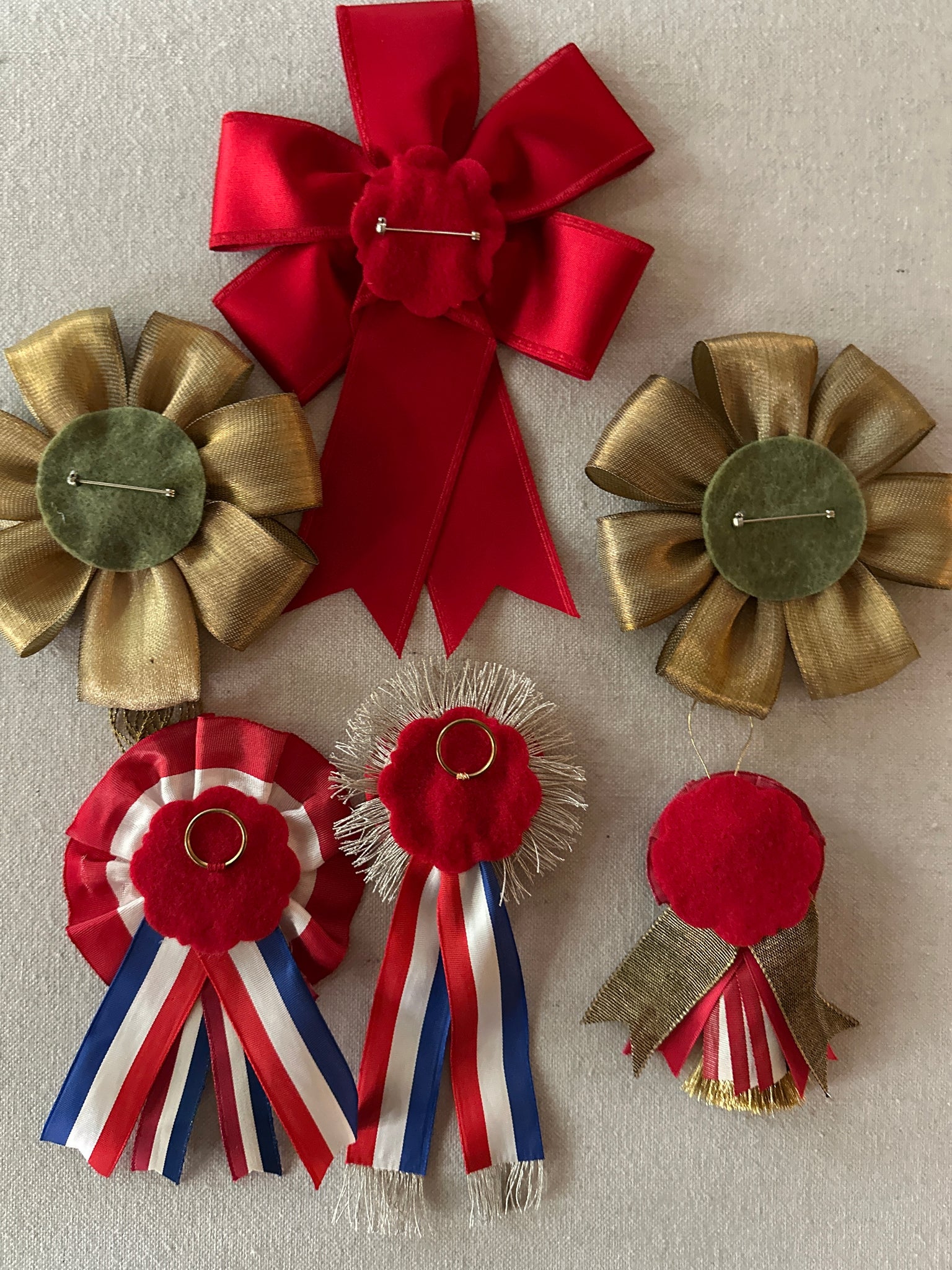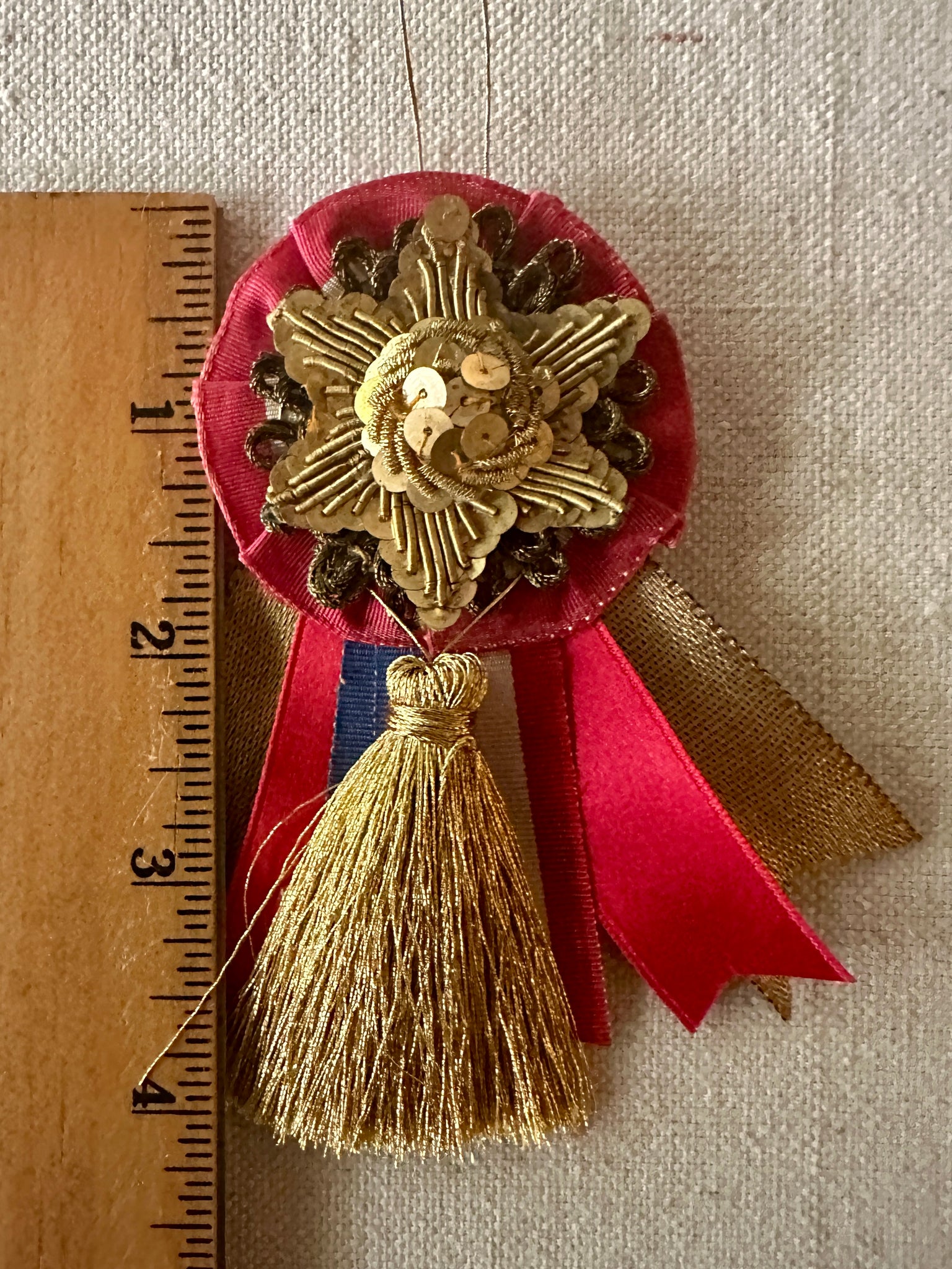 Rosettes are made with antique ribbons and silver or gold metal fringe and findings.