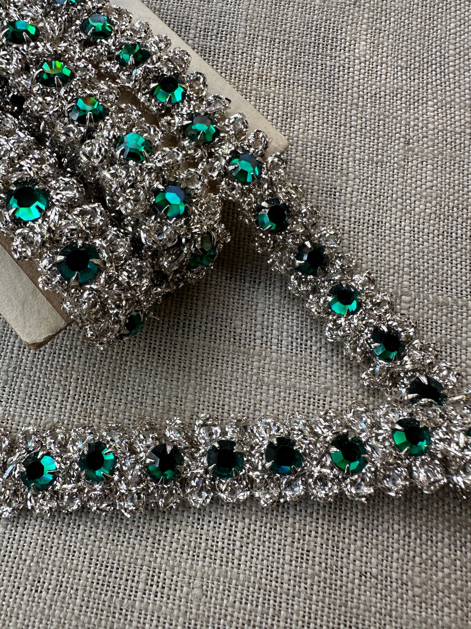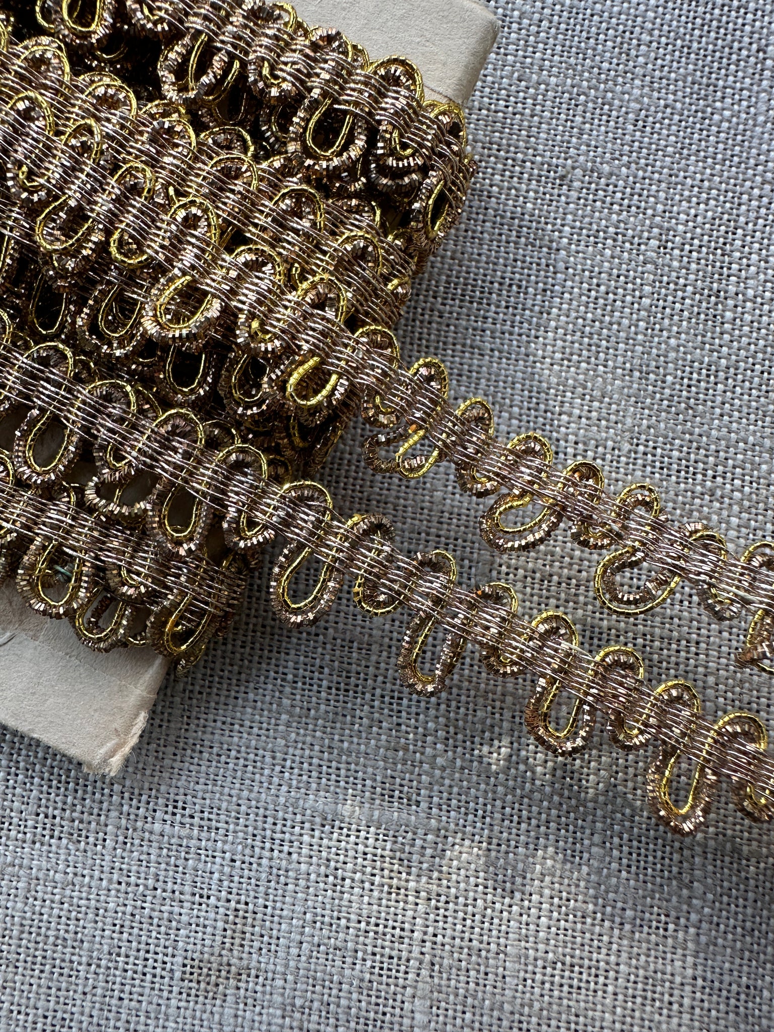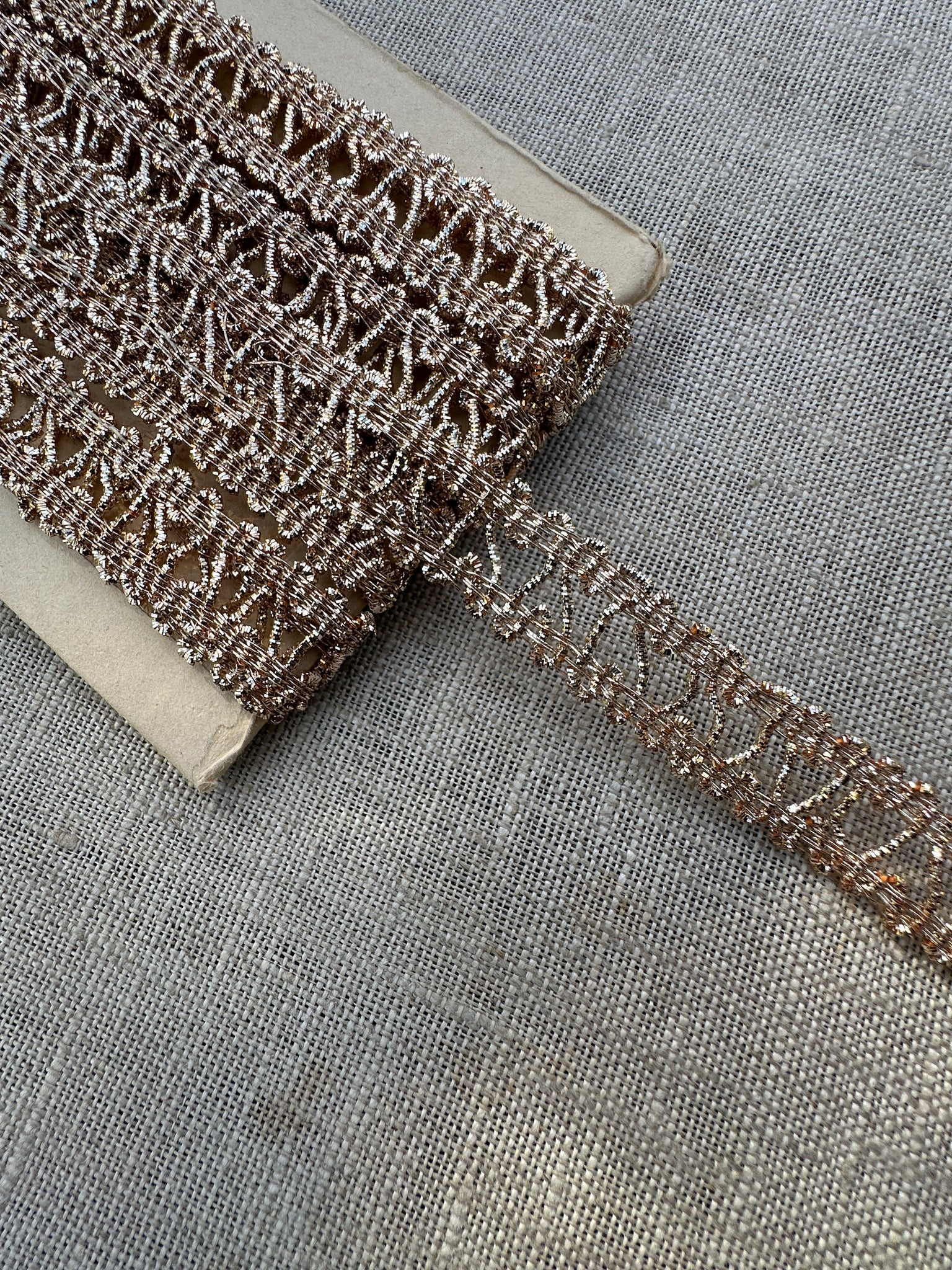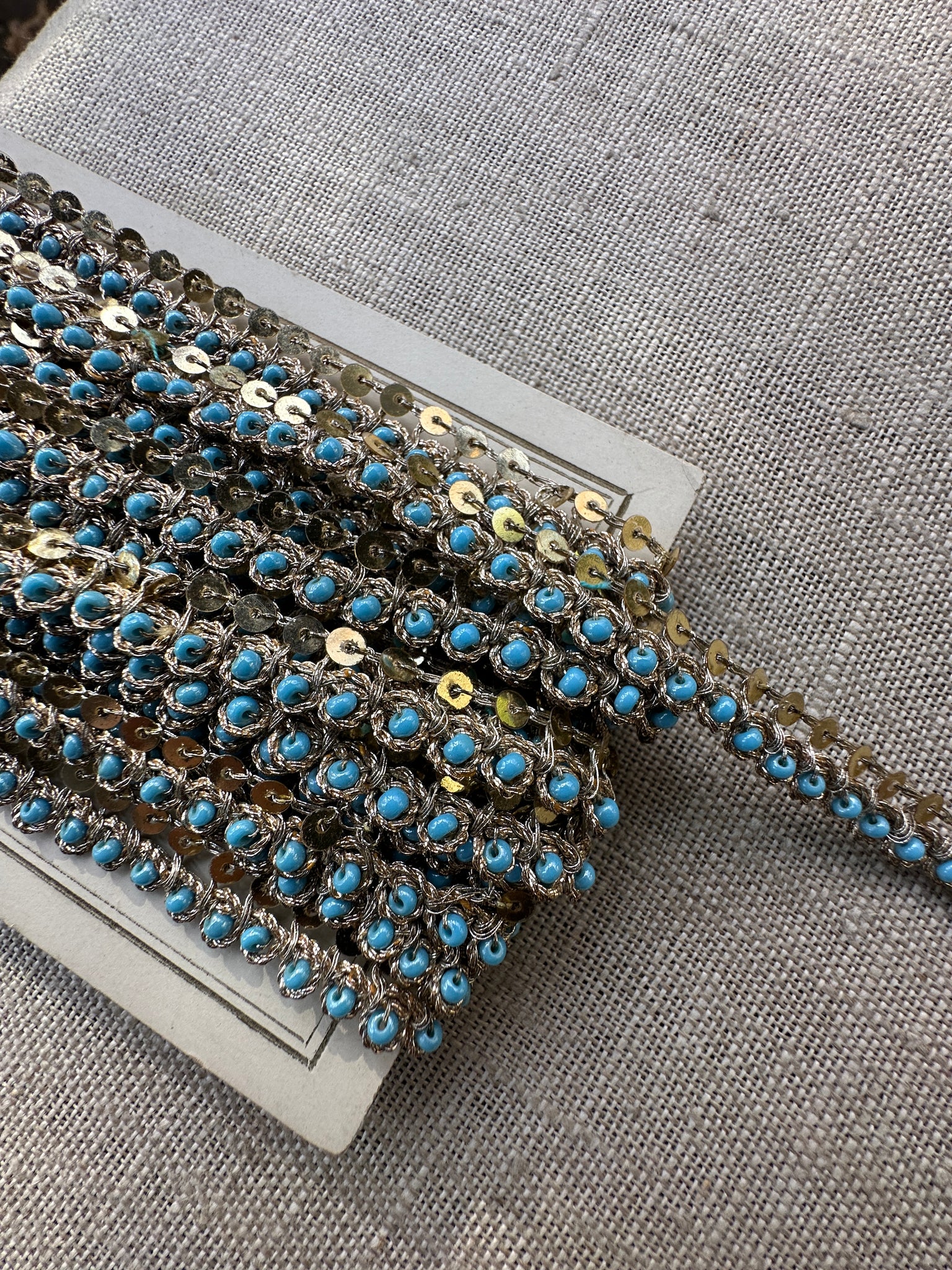 Silver and gold metal bullion, glass beads, rhinestones and silver sequins are the items used to create these hand made trims. These are unused and still bright silver and golds.